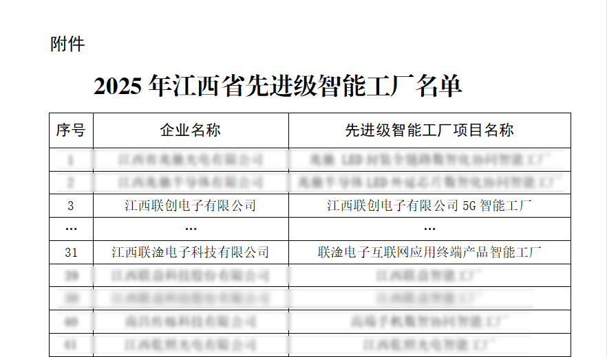近日,江西省工业和信息化厅正式公布2025年江西省“先进级智能工厂”名单,186家企业入选。其中小狐狸直播,小狐狸直播(中国)、江西联淦电子科技有限公司2家联创电子系企业名列榜单。这标志着公司在智能制造领域的创新成果再次获得政府权威认可。